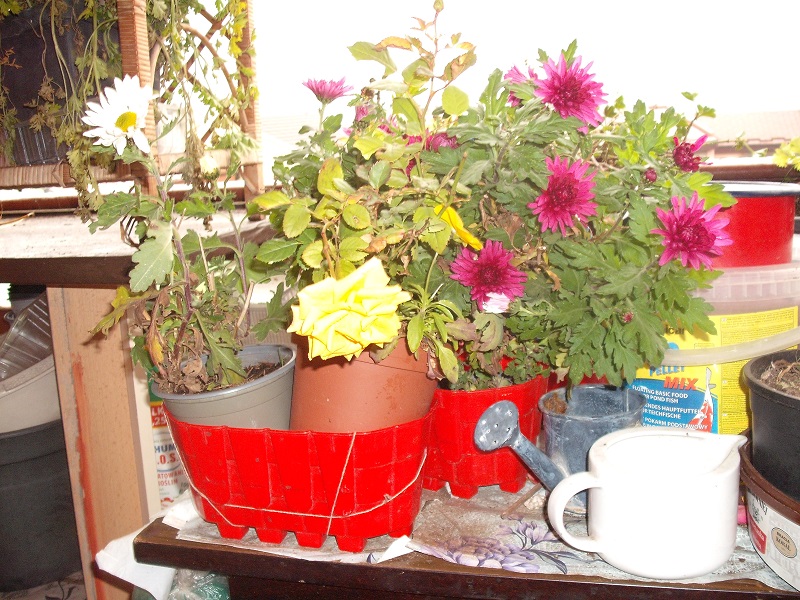 Patrzę i co widzę ?pierwszy śnieg nam upadł .A tu NADAL kwiaty kwitną .Śmiesznie to wygląda .Kwitną ,bo je schowałam .By pożaru nie wywołać .